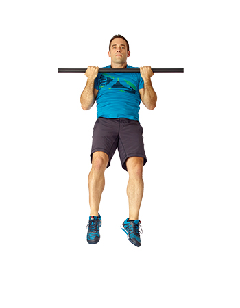 - Stand beneath a pull-up bar so you can grasp the bar with a double-overhand grip, elbows slightly bent. If the bar is out of reach with your feet on the floor, position a bench, large box, or other sturdy platform beneath it to give you a boost.