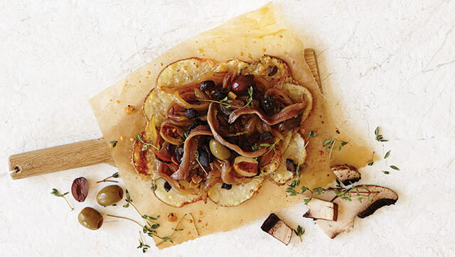 Savory and satisfying, pissaladière is a classic southern French pizzalike tart made with caramelized onions, garlic, anchovies, olives — and no cheese! We throw mushrooms into the mix here. This hearty, simple crust is terrific with full-flavored toppings.